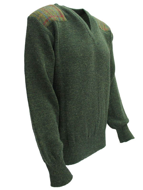 Vee neck sweater with Harris Tweed patches Mossgreen