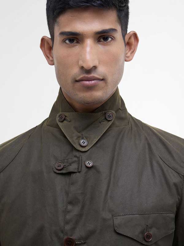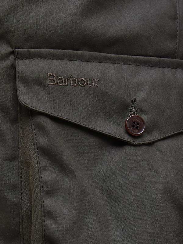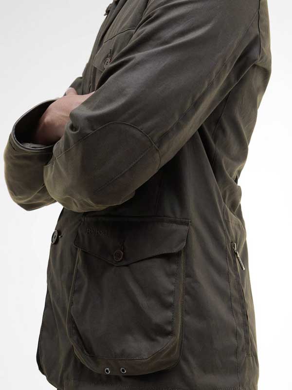 Het is een middelzwaar gewaxt katoenen jasje met zachte leren boorden, schouder- en elleboogstukken, twee achterzakken met rits en een kraag met knoopsluiting. Gevoerd met Barbour tartan, weerspiegelt dit jasje traditionele Barbour-elementen, zoals klassieke balgzakken op heuphoogte en een enkele borstzak.
