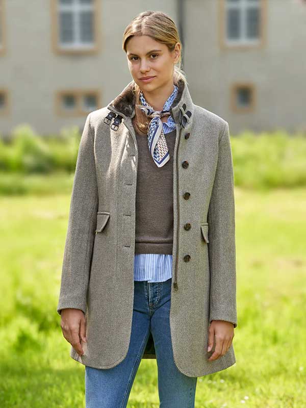 De tweedjas voor dames “Paula” valt op door de exclusieve wol-kasjmiermix in combinatie met de karakteristieke, robuuste en verfijnde weving van tweed. Dit hoogwaardige materiaal biedt niet alleen uitzonderlijke warmte en duurzaamheid, maar geeft de jas ook een onderscheidende textuur en diepte.