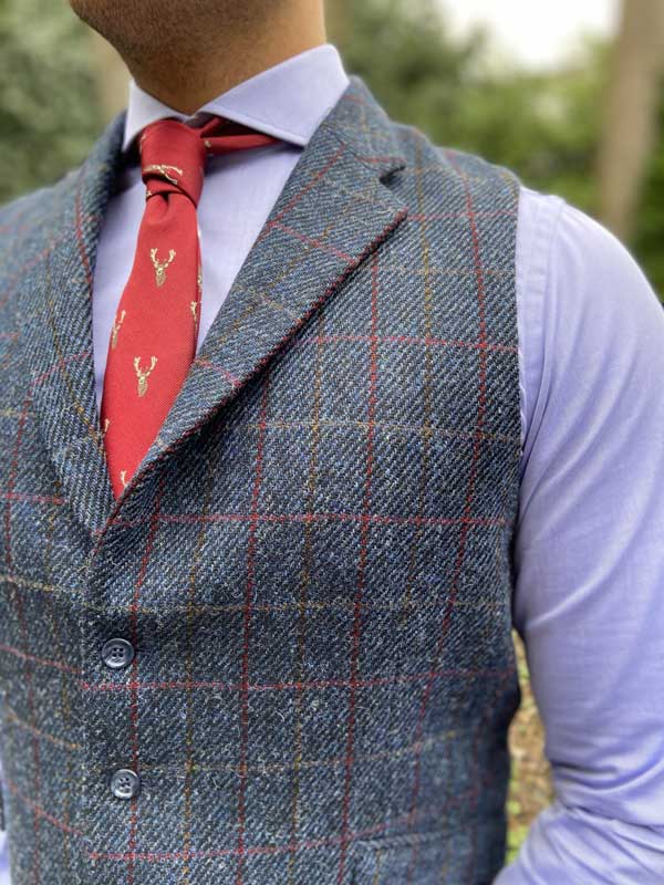 Harris Tweed Vestje Wales Met Revers In Red-Blue Check
