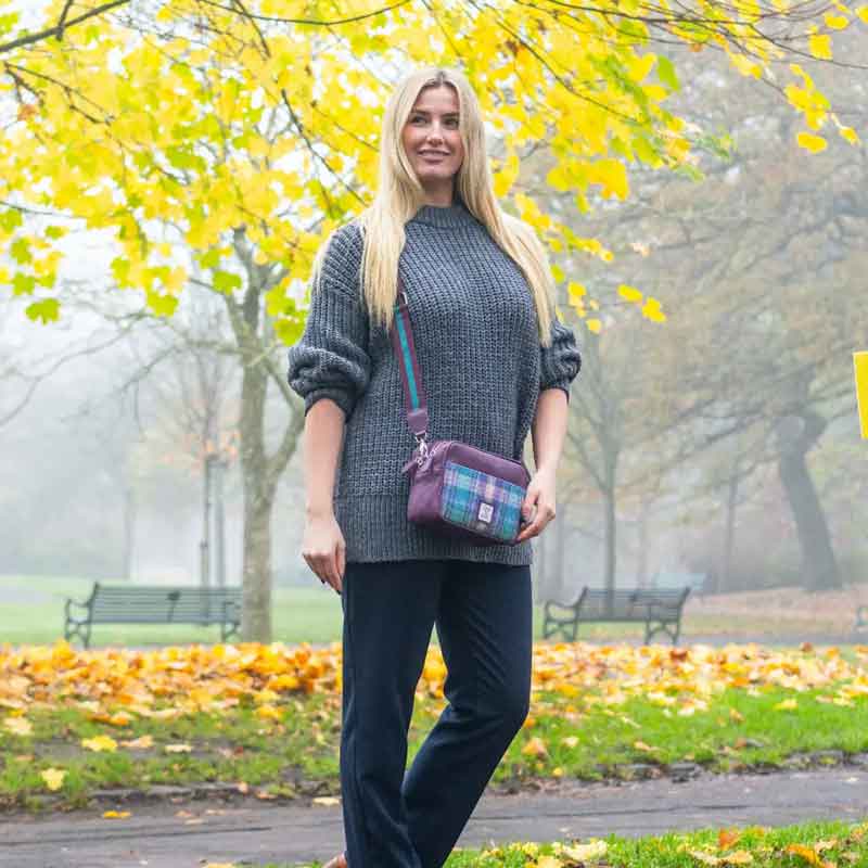 Harris Tweed Camera Bag In Green/Purple Plaid.