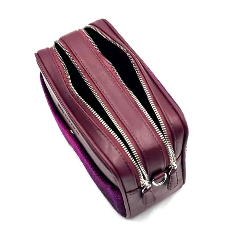 Deze Harris Tweed cameratas is ontworpen met twee interne ritsvakken voor al je essentiële spullen, een extern ritsvak en een open vak met een magnetische sluiting.