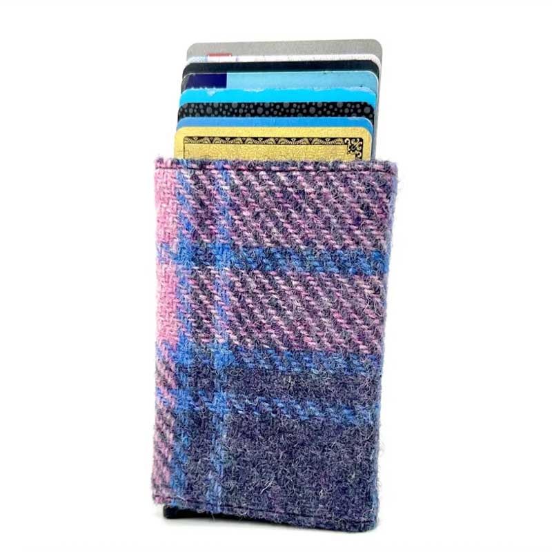 Onze Harris Tweed pop-up kaarthouder spreidt uw pasjes uit met één druk op de knop en beschermt ze tegen RFID-skimming dankzij de aluminium behuizing.