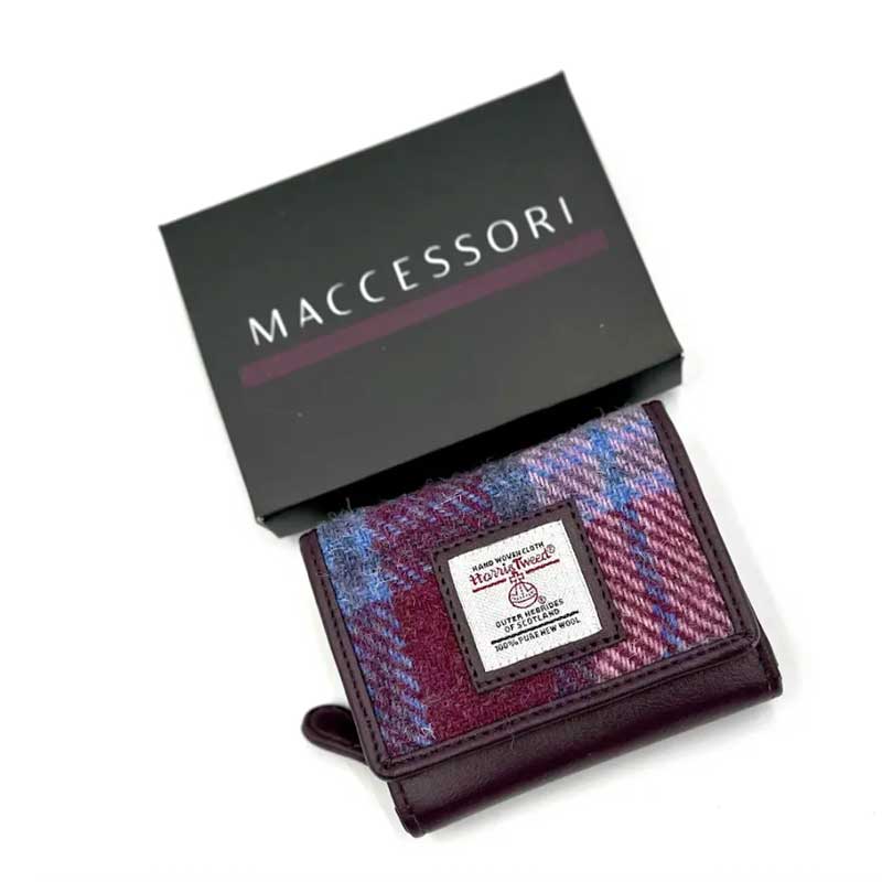 Onze trifold purse is verkrijgbaar in negen Harris Tweed-kleuren. De afwerking van het veganistisch leer verschilt afhankelijk van de gekozen Harris Tweed-kleur:– Turquoise Herringbone – Grijs veganistisch leer – Purple Check – Ossenbloed veganistisch leer – Green/Purple Check – Paars veganistisch leer – Blue/Brown Check, Country Green – Bruin veganistisch leer – Maple – Olijfkleurig veganistisch leer – Pastel Pink – Berry Jam veganistisch leer – Blue/Pink Check – Zwart veganistisch leer