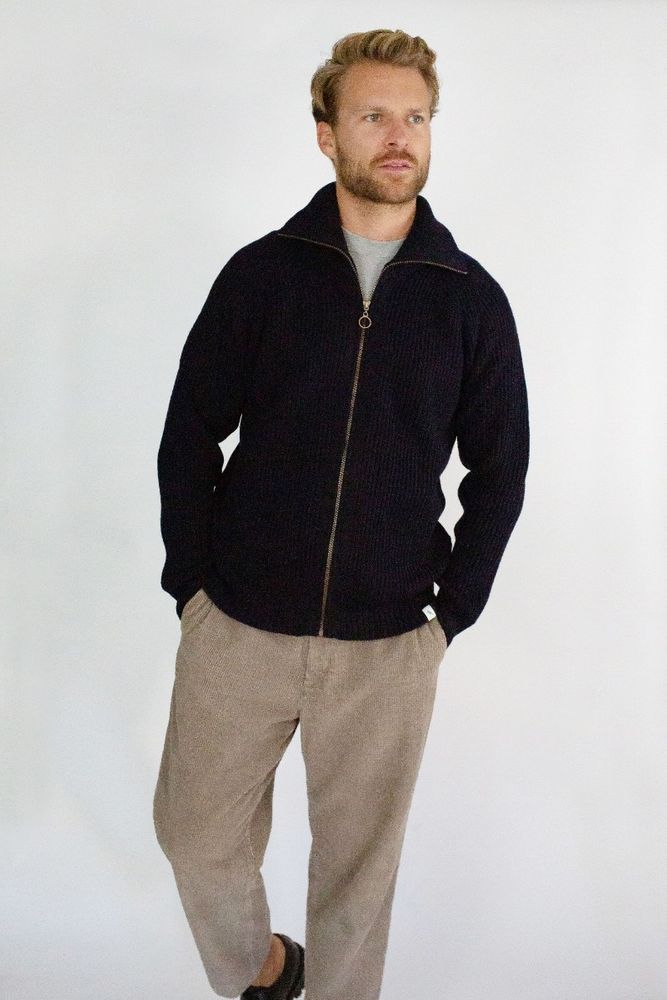 The Foxton Cardigan is stylish funnel neck zip cardigan. This 7gge Merino wool cardigan is a perfect layering piece and great for making a statement. A raglan sleeve makes the Foxton cardigan perfectly fitted around the shoulders.