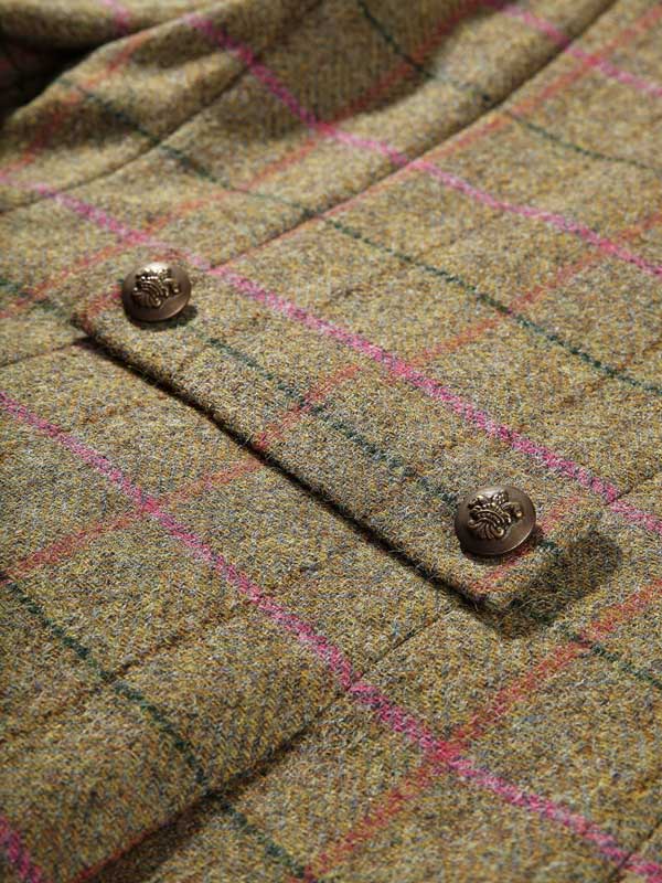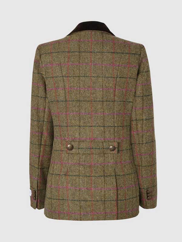 – Damesjas van Yorkshire Tweed in roze ruit– Tweed afkomstig van weverijen in Yorkshire– Geweven van zuivere wol– Fluwelen kraag en afwerking– Halve riem en zijsplitten– Knoppen met embleem en metaallook– Paisley voering– Moderne snit