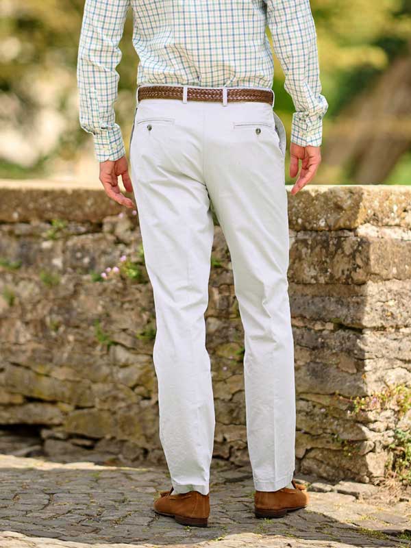 Klassieke heren chino ‘‘Mr. Jones” gemaakt van premium Pima katoen als ideale zomerbroek voor warme dagen. Pima-katoen komt uit Peru en is dankzij de ideale groeiomstandigheden en de bijzonder lange vezels de beste katoenkwaliteit ter wereld. Het wordt vooral gewaardeerd om zijn uitzonderlijke zachtheid, schitterende glans en hoge duurzaamheid. Dankzij een beetje stretch zijn deze broeken vormvast, kreukvrij en comfortabel. Ze hebben een rechte pijp, Franse zakken, twee achterzakken met knoop, riemlussen en een horlogezakje in een normale pasvorm. Dit eigentijdse, slimme en comfortabele model is een perfecte allrounder voor elke gelegenheid en mag in geen enkele garderobe ontbreken.